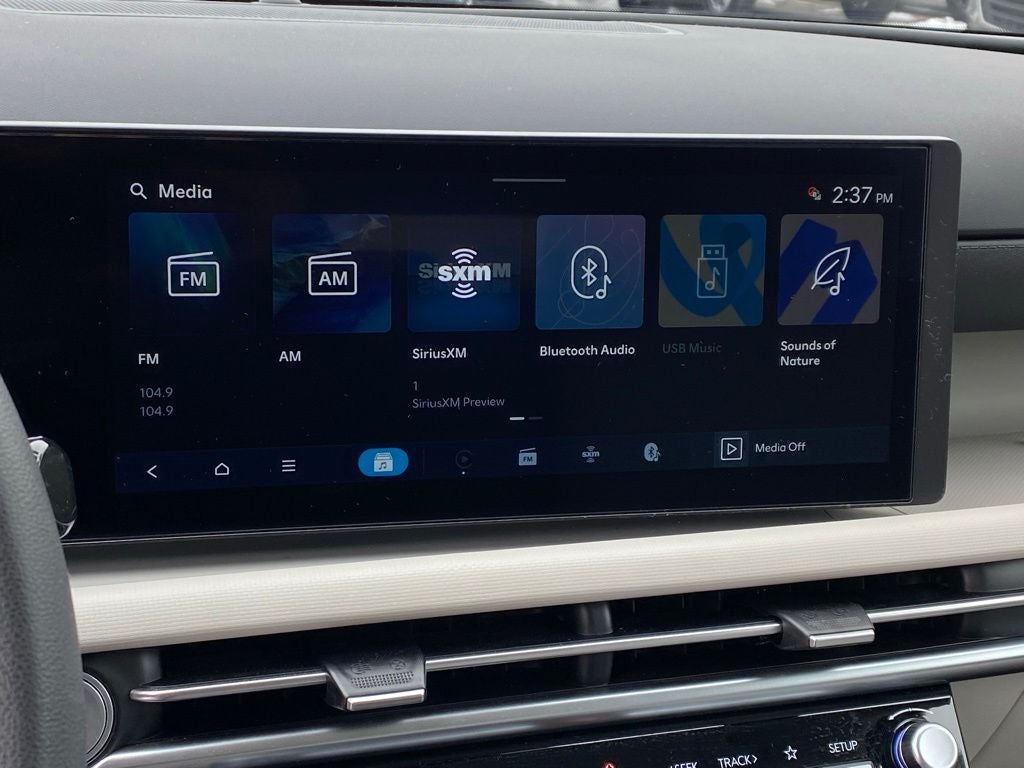 - Radio: AM/FM/HD Audio System -inc: 12.3" color touchscreen display, 6 speakers, SiriusXM satellite radio system (3-month trial subscription), wireless Apple CarPlay and Android Auto integration, controller OTA update capability, Blue Link connected car system and USB connectivity