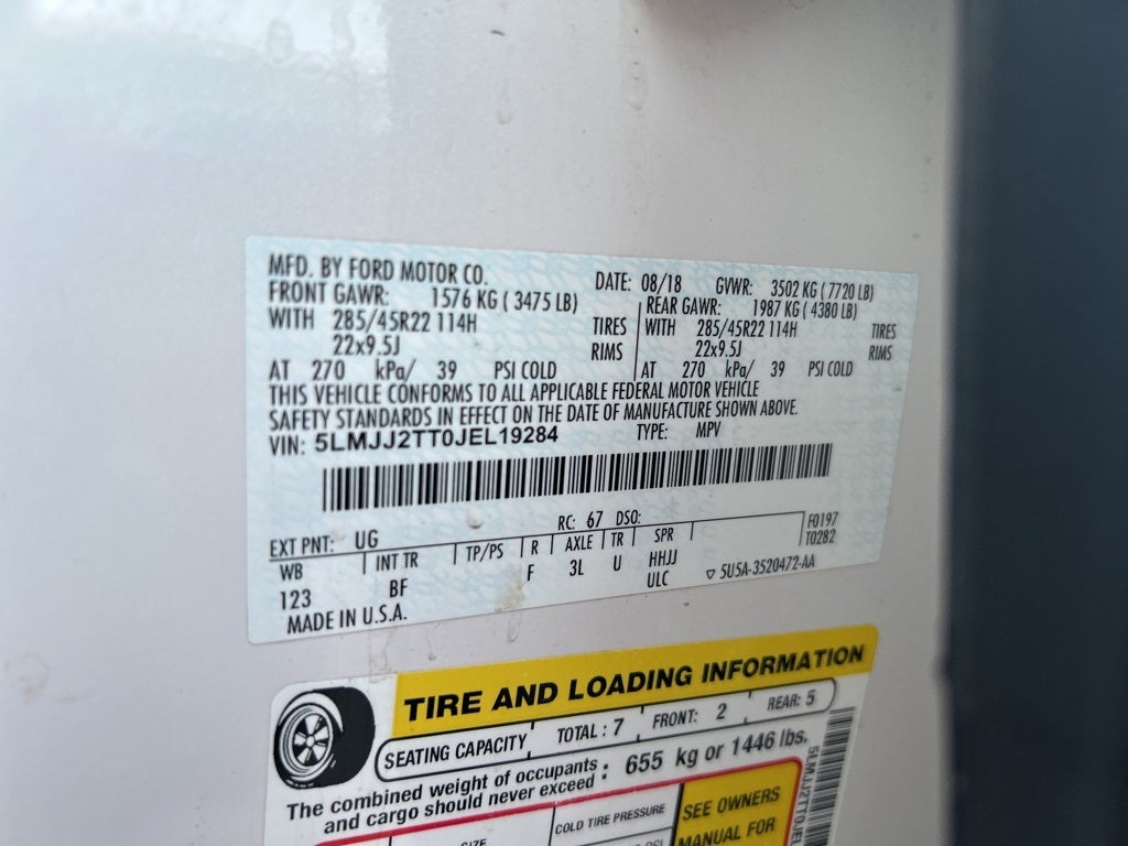 4WD, Alpine Leather, 1st & 2nd Row All-Weather Floor Liners, 20 Speakers, 3.73 Axle Ratio, 3rd row seats: split-bench, 4-Wheel Disc Brakes, ABS brakes, Adaptive suspension, Adjustable pedals, Air Conditioning, Alloy wheels, AM/FM radio: SiriusXM, AppLink/Apple CarPlay and Android Auto, Audio memory, Auto High-beam Headlights, Auto tilt-away steering wheel, Auto-dimming door mirrors, Auto-dimming Rear-View mirror, Auto-leveling suspension, Automatic temperature control, Bodyside moldings, Brake assist, Bright Roof Rack w/Black Crossbars, Bumpers: body-color, Cargo Package, Chalet Theme, Compass, Delay-off headlights, Driver door bin, Driver vanity mirror, Driver's Seat Mounted Armrest, Dual front impact airbags, Dual front side impact airbags, Electronic Stability Control, Emergency communication system: 911 Assist, Equipment Group 800A Black Label, Exterior Parking Camera Rear, Floor Carpet/Mats - Espresso w/Dinamica Suede, Four wheel independent suspension, Front anti-roll bar, Front Bucket Seats, Front dual zone A/C, Front fog lights, Front reading lights, Fully automatic headlights, Garage door transmitter: HomeLink, Genuine wood console insert, Genuine wood door panel insert, GVWR: 7,625 lbs Payload Package, Headliner - Alpine Dinamica Suede, Heads-Up Display, Heated door mirrors, Heated front seats, Heated rear seats, Heated steering wheel, HVAC memory, Illuminated entry, Leather steering wheel, Leather-Wrapped Interior - Alpine/Espresso, Low tire pressure warning, Memory seat, Navigation System, Occupant sensing airbag, Outside temperature display, Overhead airbag, Overhead console, Panic alarm, Passenger door bin, Passenger seat mounted armrest, Passenger vanity mirror, Pedal memory, Perfect Position Seating w/Active Motion, Power door mirrors, Power driver seat, Power Liftgate, Power moonroof: Panoramic Vista Roof, Power passenger seat, Power steering, Power windows, Radio data system, Radio: Revel Ultima AM/FM/HD/MP3 Audio System, Rain sensing wipers, Rear air conditioning, Rear anti-roll bar, Rear audio controls, Rear reading lights, Rear window defroster, Rear window wiper, Reclining 3rd row seat, Remote CD player, Remote keyless entry, Roof rack: rails only, Security system, Silverwood Appliques, SiriusXM Radio, Speed control, Speed-sensing steering, Speed-Sensitive Wipers, Split folding rear seat, Spoiler, Steering wheel memory, Steering wheel mounted audio controls, SYNC 3 Communications & Entertainment System, Tachometer, Telescoping steering wheel, Tilt steering wheel, Traction control, Trip computer, Turn signal indicator mirrors, Variably intermittent wipers, Venetian Lthr Htd/Cooled Captain's Chair Seat (B), Ventilated front seats, Wheels: 22 21 Spoke Black Label Ultra-Bright.