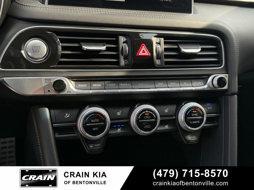 15 Speakers, 4-Wheel Disc Brakes, ABS brakes, Air Conditioning, Alloy wheels, AM/FM radio: SiriusXM, Android Auto & Apple CarPlay, Anti-whiplash front head restraints, Auto High-beam Headlights, Auto-dimming door mirrors, Auto-dimming Rear-View mirror, Automatic temperature control, Brake assist, Bumpers: body-color, Delay-off headlights, Driver door bin, Driver vanity mirror, Dual front impact airbags, Dual front side impact airbags, Electronic Stability Control, Emergency communication system: Genesis Connected Services, Exterior Parking Camera Rear, Four wheel independent suspension, Front anti-roll bar, Front Bucket Seats, Front Center Armrest, Front dual zone A/C, Front reading lights, Fully automatic headlights, Garage door transmitter: HomeLink, Heated & Ventilated Front Bucket Seats, Heated door mirrors, Heated front seats, Illuminated entry, Knee airbag, Leather Seat Trim, Low tire pressure warning, Memory seat, Navigation System, Occupant sensing airbag, Option Group 01, Outside temperature display, Overhead airbag, Overhead console, Panic alarm, Passenger door bin, Passenger vanity mirror, Power door mirrors, Power driver seat, Power passenger seat, Power steering, Power windows, Radio: AM/FM/HD Radio/SiriusXM Lexicon Audio, Rear anti-roll bar, Rear reading lights, Rear seat center armrest, Rear window defroster, Remote keyless entry, Security system, Speed control, Speed-Sensitive Wipers, Split folding rear seat, Steering wheel memory, Steering wheel mounted audio controls, Tachometer, Telescoping steering wheel, Tilt steering wheel, Traction control, Trip computer, Turn signal indicator mirrors, Variably intermittent wipers, Ventilated front seats.