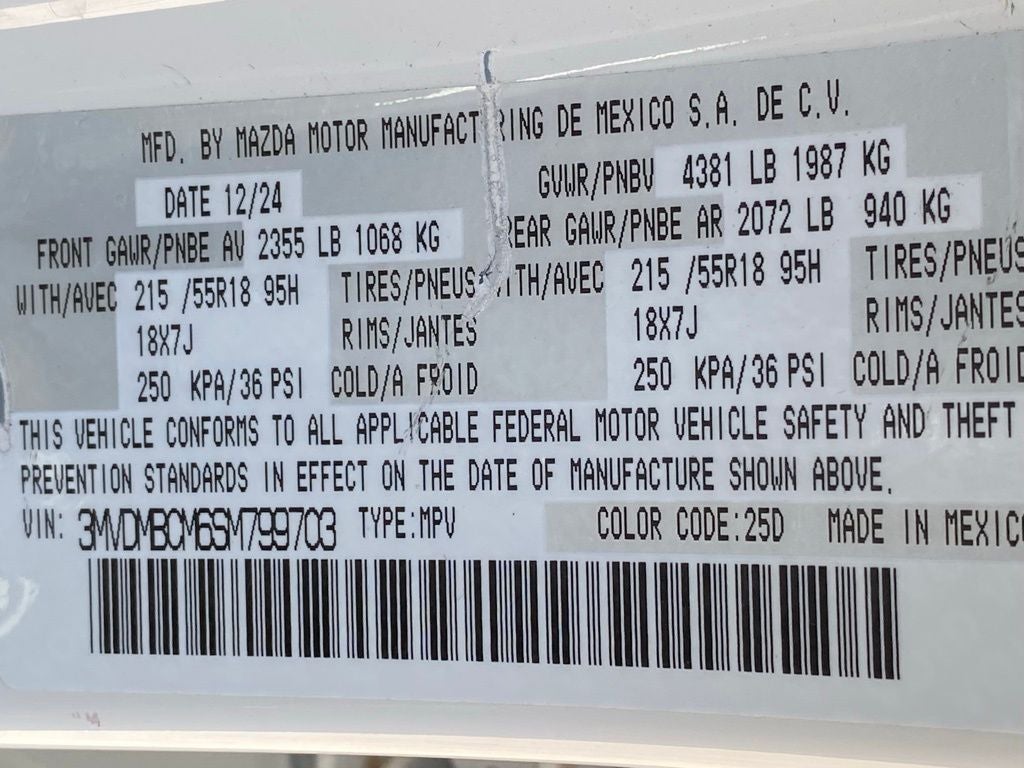 2025 Mazda CX-30 AWD SKYACTIV® 2.5L 4-Cylinder DOHC 16V 6-Speed Automatic CX-30 2.5 S Preferred Package, 4D Sport Utility, SKYACTIV® 2.5L 4-Cylinder DOHC 16V, 6-Speed Automatic, AWD, Snowflake White Pearl, Black Premium Synthetic, 4-Wheel Disc Brakes, 6 Speakers, ABS brakes, Air Conditioning, Alloy wheels, AM/FM radio, AppLink/Apple CarPlay and Android Auto, Auto High-beam Headlights, Automatic temperature control, Brake assist, Bumpers: body-color, Compass, Delay-off headlights, Driver door bin, Driver vanity mirror, Dual front impact airbags, Dual front side impact airbags, Electronic Stability Control, Emergency communication system: Mazda Connected Services (3-year trial subscription included), Exterior Parking Camera Rear, Front anti-roll bar, Front Bucket Seats, Front Center Armrest, Front dual zone A/C, Front reading lights, Front wheel independent suspension, Fully automatic headlights, Heated door mirrors, Heated Front Bucket Seats, Heated front seats, Illuminated entry, Knee airbag, Leather Shift Knob, Leather steering wheel, Leatherette Seat Trim, Low tire pressure warning, MAZDA CONNECT Infotainment System, Memory seat, Occupant sensing airbag, Outside temperature display, Overhead airbag, Overhead console, Panic alarm, Passenger door bin, Passenger vanity mirror, Power door mirrors, Power driver seat, Power moonroof, Power steering, Power windows, Radio data system, Radio: AM/FM Audio System, Rain sensing wipers, Rear seat center armrest, Rear side impact airbag, Rear window defroster, Rear window wiper, Remote keyless entry, Snowflake White Pearl Mica Paint Charge, Speed control, Speed-sensing steering, Split folding rear seat, Spoiler, Steering wheel mounted audio controls, Tachometer, Telescoping steering wheel, Tilt steering wheel, Traction control, Trip computer, Turn signal indicator mirrors, Variably intermittent wipers, Wheels: 18 x 7J Aluminum Alloy. CARFAX One-Owner. Clean CARFAX.