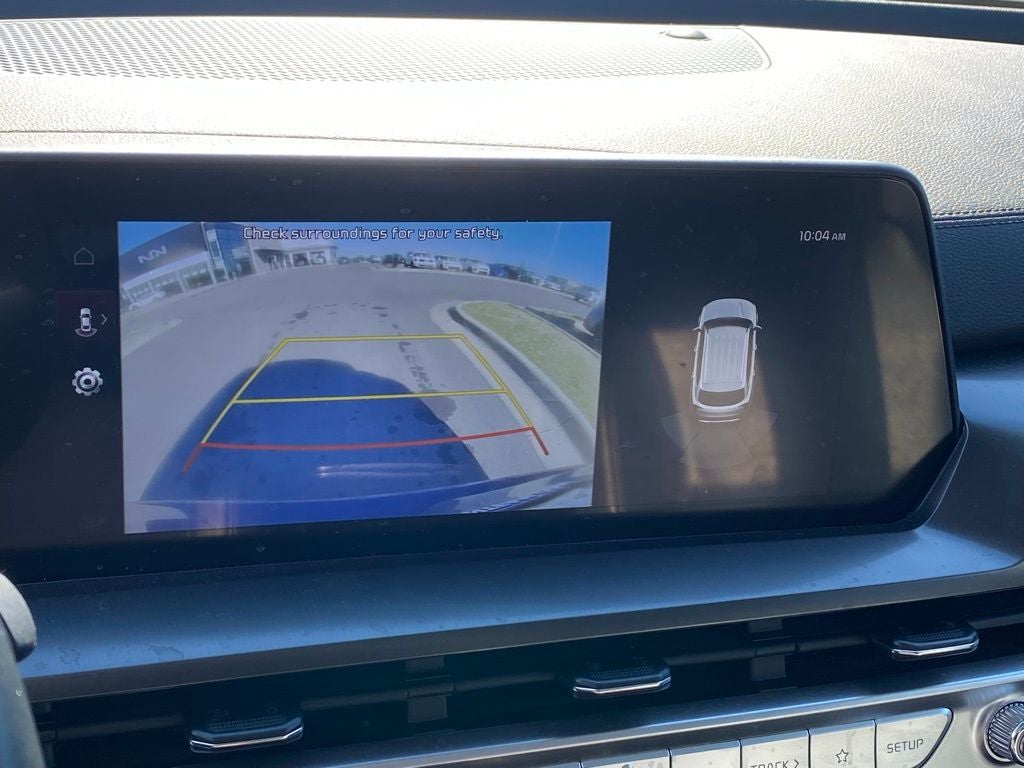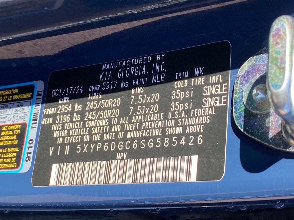 KIA Certified Eligible Certified, 3rd row seats: split-bench, 4-Wheel Disc Brakes, 6 Speakers, ABS brakes, Air Conditioning, Alloy wheels, AM/FM radio: SiriusXM, Apple CarPlay & Android Auto, Auto High-beam Headlights, Automatic temperature control, Brake assist, Bumpers: body-color, Carpeted Floor Mats, Cross Bars, Delay-off headlights, Driver door bin, Driver vanity mirror, Dual front impact airbags, Dual front side impact airbags, Electronic Stability Control, Emergency communication system: 911 Connect, Exterior Parking Camera Rear, Four wheel independent suspension, Front anti-roll bar, Front Bucket Seats, Front Center Armrest, Front dual zone A/C, Front reading lights, Fully automatic headlights, Heated door mirrors, Heated Front Bucket Seats, Heated front seats, Illuminated entry, Knee airbag, Leather Shift Knob, Leather steering wheel, Low tire pressure warning, Navigation System, Occupant sensing airbag, Outside temperature display, Overhead airbag, Overhead console, Panic alarm, Passenger door bin, Passenger vanity mirror, Power door mirrors, Power driver seat, Power Liftgate, Power moonroof, Power steering, Power windows, Radio data system, Radio: AM/FM Display Audio System, Rear air conditioning, Rear anti-roll bar, Rear audio controls, Rear reading lights, Rear side impact airbag, Rear window defroster, Rear window wiper, Reclining 3rd row seat, Remote keyless entry, Security system, Speed control, Speed-sensing steering, Split folding rear seat, Spoiler, Steering wheel mounted audio controls, SynTex Synthetic Leather Seat Trim, Tachometer, Telescoping steering wheel, Tilt steering wheel, Traction control, Trip computer, Turn signal indicator mirrors, Variably intermittent wipers, Wheels: 20 x 7.5 Black Finish.